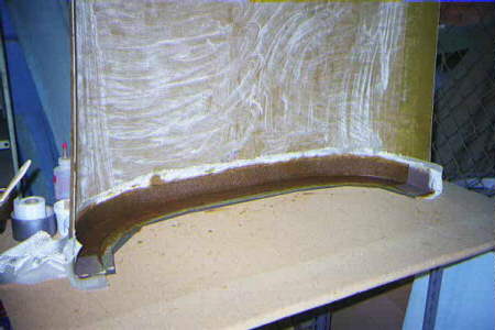 Here are a couple of pictures of the bracket being floxed to the firewall. Inside the edge of the bracket there will be a layer of fiberfax and then a sheet of stainless steel.