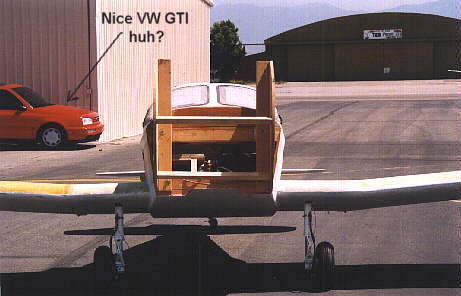 The wings are on!! Woo Hoo! You can see the wing construction in more detail on the Wings Page. I built a cradle that bolts to the engine mount rails which allows just two people to flip the airplane over. The airplane was on her back for almost a month as I filled, sanded and primed the entire underneath.